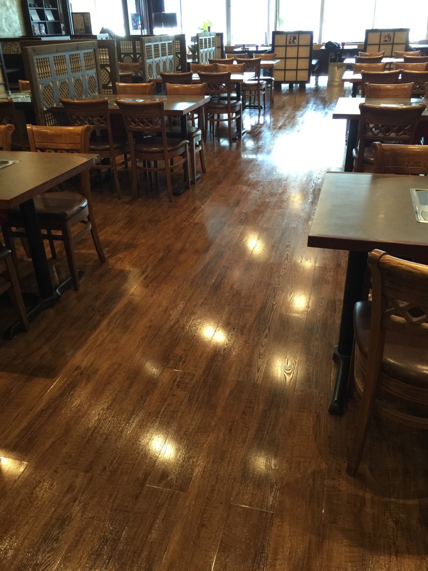 The overall result is a beautiful and functional floor that has completely updated the look of the restaurant. The combination of the realistic wood grain look, high gloss finish, and the durability of the VCT flooring makes it a perfect solution for a busy restaurant environment. We are confident that this floor will stand up to the rigors of daily use and will remain beautiful for years to come.