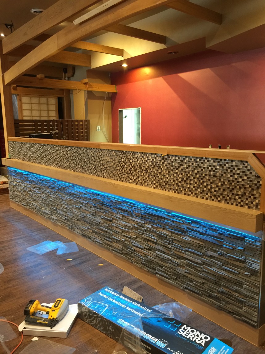 Wow, what a stunning transformation! This new counter wall is the perfect centerpiece for our restaurant. The stacked stone adds depth and texture, the mosaic tile adds a touch of modern sophistication, and the LED lighting is a truly unique touch. We are
