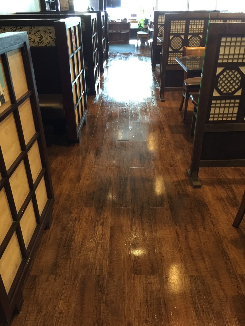 The overall result is a beautiful and functional floor that has completely updated the look of the restaurant. The combination of the realistic wood grain look, high gloss finish, and the durability of the VCT flooring makes it a perfect solution for a busy restaurant environment. We are confident that this floor will stand up to the rigors of daily use and will remain beautiful for years to come.